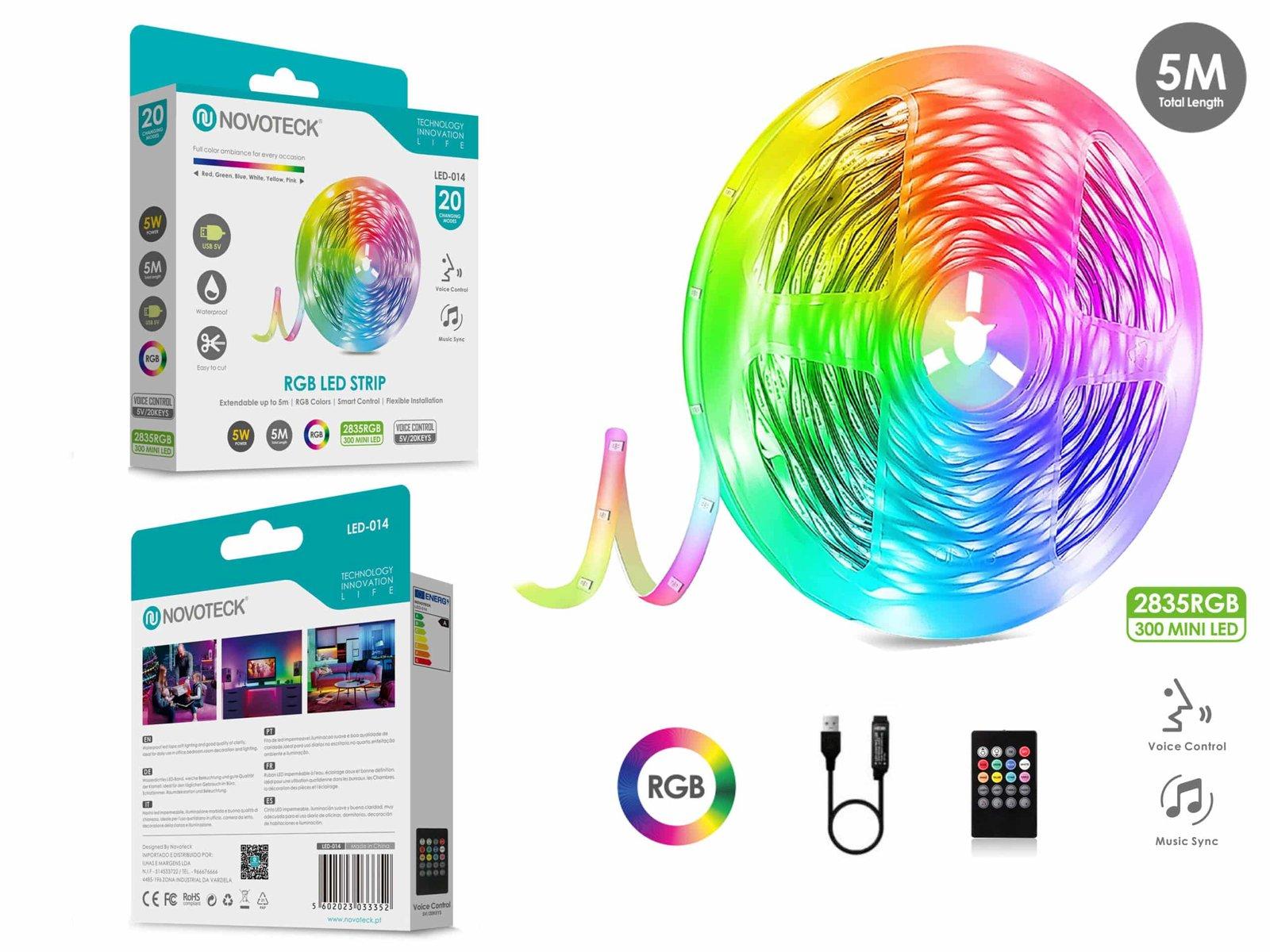 Descrição: A Fita LED RGB Novoteck LED-014 é a sua solução de iluminação interativa que responde à sua voz e música. Com 5 metros de comprimento e 300 mini LEDs, esta fita oferece uma experiência de iluminação dinâmica que pode ser controlada sem toque, perfeita para animar qualquer festa ou criar a atmosfera desejada em casa. Com sincronização de música e comandos de voz, o ambiente ganha vida ao som das suas canções preferidas. A proteção IP65 garante a durabilidade e resistência à água para instalações internas e externas. Especificações: Modelo: LED-014 Comprimento: 5 metros Quantidade de LEDs: 300 mini LEDs Potência: 5W Controle: Comandos de voz e sincronização musical Tipo de LED: 2835RGB Proteção: IP65, contra água e poeira Funções extras: Reação ao som, variedade de cores e efeitos luminosos Instalação: Fixação adesiva simples Voltagem: 5V (USB powered) Certificações: CE e RoHS Características: Controle por voz e música para uma experiência personalizada e mãos-livres. Fácil de montar com fita adesiva, não necessita de ferramentas. À prova d'água com classificação IP65, ideal para qualquer ambiente. Iluminação LED de baixo consumo energético, amiga do ambiente. Alimentação prática via USB, compatível com diversos dispositivos. Com a Fita LED RGB Novoteck LED-014, traga interatividade e cor para seus espaços com facilidade e estilo.