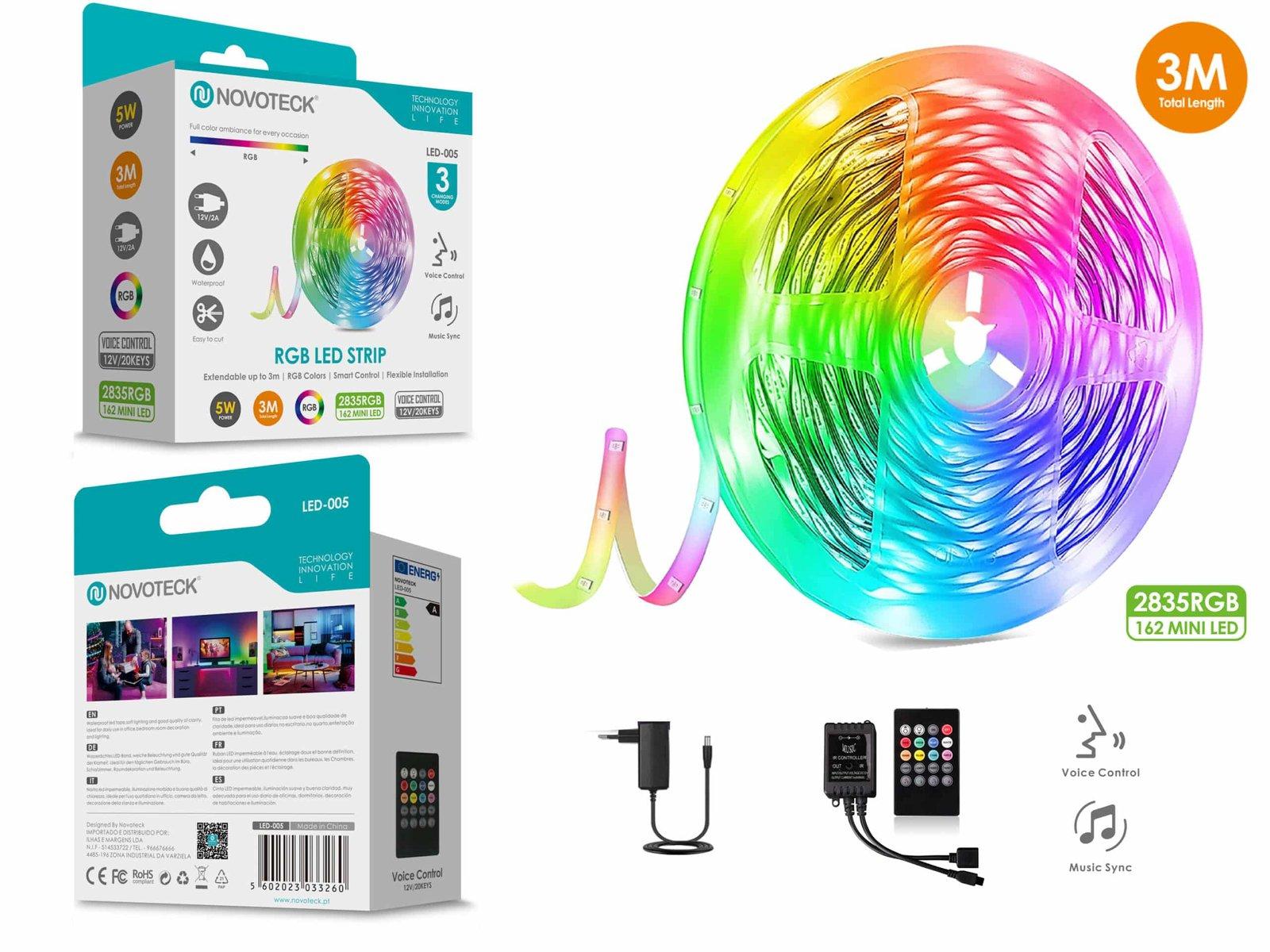 Fita de LED RGB Controlada por Voz NOVOTECK LED-005 - 3M, Sincronização Musical, Iluminação Inteligente Este é o conjunto de Fita de LED RGB da NOVOTECK, modelo LED-005, que proporciona uma experiência de iluminação interativa com controle de voz e sincronização musical para animar qualquer espaço. Características do produto: A fita possui 3 metros de comprimento e é equipada com 162 mini LEDs tipo 2835 RGB, oferecendo uma gama de cores vivas e intensas. Controle de voz e sincronização com a música, permitindo que as luzes alterem cores e ritmos em resposta a sons e músicas do ambiente. Resistência à água, tornando-a adequada para uma variedade de configurações internas e externas. Fácil instalação graças ao adesivo na parte de trás da fita, proporcionando uma montagem simples e segura. Baixo consumo de energia de 5W, garantindo uma iluminação econômica e sustentável. Perfeita para festas, eventos ou simplesmente para adicionar um toque de cor a qualquer ambiente doméstico, a Fita de LED RGB da NOVOTECK LED-005 é uma opção versátil e divertida para iluminação personalizada.