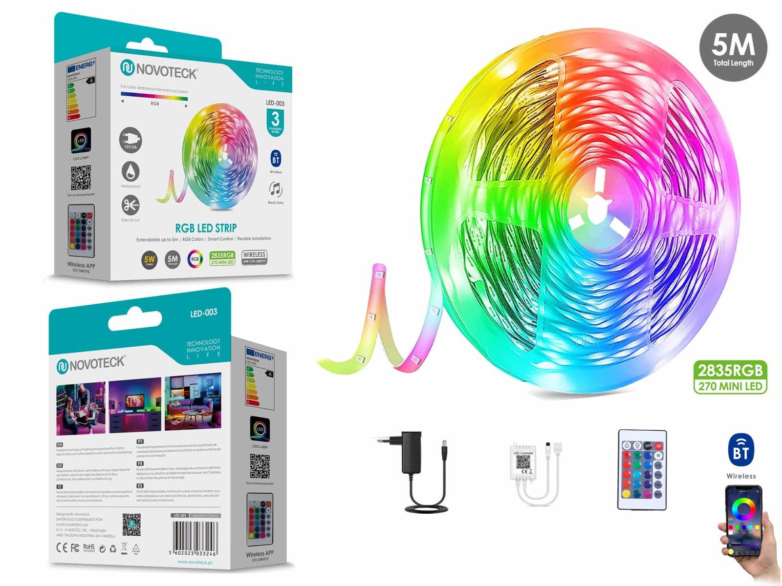 Fita de LED RGB Controlada por App NOVOTECK LED-003 - 5M, Bluetooth, Resistente à Água Este é o conjunto de Fita de LED RGB da NOVOTECK, modelo LED-003, que oferece funcionalidade avançada com controle sem fio por aplicativo, tornando-o uma escolha popular para iluminação inteligente e personalizada. Características do produto: Fita de LED de 5 metros com 270 mini LEDs RGB tipo 2835, proporcionando uma iluminação colorida e intensa para qualquer ambiente. Controle sem fio Bluetooth através de um aplicativo, permitindo ajustar as cores e padrões de iluminação diretamente do seu smartphone. A fita é resistente à água, ideal para uso em ambientes internos e externos, oferecendo maior versatilidade. Fácil instalação com a parte traseira adesiva, permitindo uma aplicação segura e sem complicações em várias superfícies. Baixo consumo de energia de 5W, assegurando uma solução de iluminação eficiente e econômica. Perfeita para quem deseja uma experiência de iluminação personalizada e conveniente, a Fita de LED RGB da NOVOTECK LED-003 é ideal para criar ambientes dinâmicos em casa, eventos ou estabelecimentos comerciais.