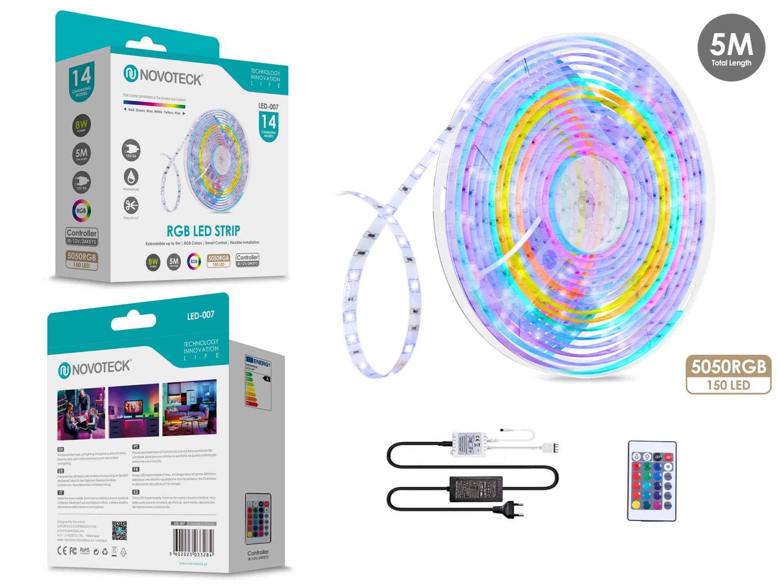 Fita de LED RGB NOVOTECK LED-007 - 5M, 150 LEDs, com Controle Remoto e 14 Cores Dinâmicas Apresentamos a Fita de LED RGB da NOVOTECK, modelo LED-007, uma escolha perfeita para quem deseja adicionar uma iluminação colorida e personalizável a qualquer espaço. Características do produto: Fita de LED de 5 metros com 150 LEDs tipo 5050 RGB, conhecidos por seu brilho intenso e cores vivas. Consumo de energia de 8W, proporcionando uma solução de iluminação eficiente sem comprometer a luminosidade. Controle remoto incluído, com 14 configurações de cor, para ajustar facilmente a atmosfera e o ambiente sem precisar tocar na fita. Flexível e fácil de instalar com adesivo na parte traseira, permitindo aplicação em diversas superfícies e em áreas que requerem iluminação personalizada. Ideal para ambientes como salas de estar, quartos, bares, ou para eventos especiais, oferecendo uma ampla gama de cores e efeitos para escolher. Esta fita de LED RGB da NOVOTECK LED-007 é uma maneira fantástica de realçar a decoração de qualquer ambiente, proporcionando uma iluminação que pode ser adaptada para qualquer ocasião.