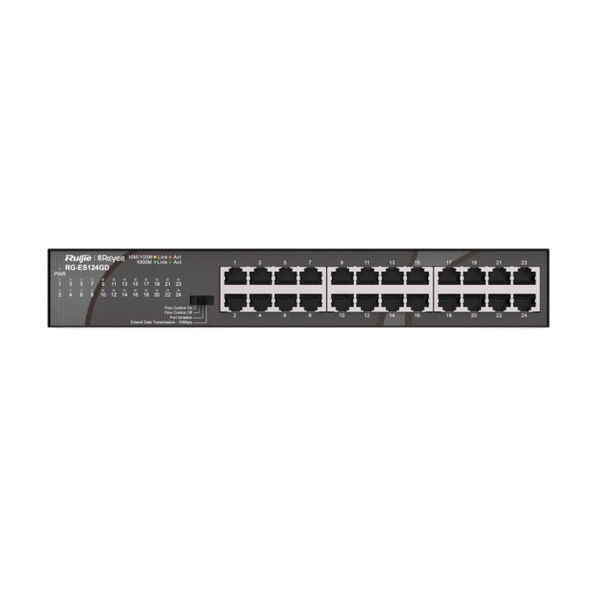 O switch Ruijie Networks G-ES124GD é um dispositivo não gerenciado projetado para ambientes de rede que exigem alta confiabilidade e facilidade de uso. Este switch de 24 portas RJ-45 Gigabit Ethernet (10/100/1000 Mbps) oferece uma largura de banda total de 48 Gbit/s e uma taxa de encaminhamento de 35,71 milhões de pacotes por segundo (MPPS), garantindo desempenho eficiente e transmissão de dados fluida. Conta com funções avançadas como auto-negociação e auto MDI/MDI-X que facilitam a conexão e compatibilidade com diversos dispositivos, além de suporte a controle de fluxo em hardware que otimiza a gestão do tráfego na rede. Está equipado com um buffer de grande capacidade para evitar perda de dados e melhorar a estabilidade, mantendo operação sem reinícios frequentes. Seu design compacto, com dimensões de 280 mm de largura, 126 mm de profundidade e 44 mm de altura, adapta-se facilmente a espaços de mesa ou racks pequenos, enquanto a carcaça preta e sem ventoinha assegura funcionamento silencioso e duradouro, com média de 200.000 horas entre falhas. Alimentado por corrente alternada (100-240 V) e com consumo eficiente de 16 W, inclui proteção contra sobretensões para preservar a integridade do equipamento. Além disso, este switch é gerenciado via nuvem, permitindo monitoramento remoto simples e acessível sem necessidade de configuração local. Compatível com os padrões de sustentabilidade CE e RoHS, oferece garantia de 3 anos, refletindo sua confiabilidade e compromisso com a qualidade. O Ruijie G-ES124GD é uma solução robusta para redes empresariais que precisam de um switch não gerenciado conectado à nuvem, combinando simplicidade, desempenho e estabilidade em ambientes de escritório ou projetos de infraestrutura de rede de médio porte.